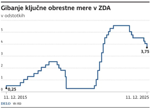 V sredo je ameriška centralna banka Federal Reserve (Fed) v skladu s pričakovanji trga še tretjič zapored za 0,25 odstotne točke znižala ključno obrestno mero – tj. obrestno mero, po kateri si banke med seboj čez noč posojajo denar. Ta tako zdaj znaša v razponu med 3,50 in 3,75 odstotka oziroma za 1,75 odstotne točke manj kot v obdobju med julijem 2023 in septembrom 2024, ko je bila s 5,25 do 5,50 odstotka najvišja po letu 2001. Odločevalci med seboj niso imeli usklajenih mnenj, saj je eden med njimi glasoval za znižanje v višini 0,50 odstotne točke, dva sta podpirala zadržanje prejšnje višine obrestne mere, preostalih devet pa je z glasovi za znižanje za 0,25 odstotne točke doseglo večino.