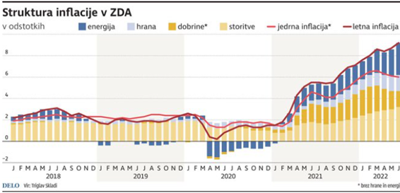 Za lažje razumevanje inflacije moramo poznati njeno strukturo. Večino višje inflacije je ob koncu lanskega leta in v začetku letošnjega predstavljala dražitev energentov in surovin, vojna in sankcije pa so začele dražiti tudi prehrano. Letos se je začela kazati nadpovprečna inflacija pri storitvah, zaradi pritiskov na plače in povišanih fiksnih stroškov, seli pa se tudi na končne proizvode. V zadnjih dveh mesecih opažamo zniževanje cen nafte, terminskih pogodb pri žitu, koruzi in soji ter nižanje cen surovin in industrijskih kovin. Če se bo tak trend nadaljeval, bo v kombinaciji z baznim efektom v začetku leta 2023 inflacija obrnila smer in se začela zniževati. Največ neznank je v Evropi, kjer lahko velika odvisnost od ruskega plina pahne evropsko gospodarstvo v recesijo ob hkrati visokih cenah energentov, če bo plina primanjkovalo.