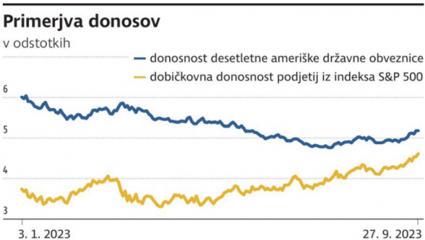 Analitiki so tako popravili pričakovanja in zdaj pričakujejo, da bodo centralne banke obrestne mere začele zniževati šele konec prihodnjega leta. To je povzročilo rast donosnosti obveznic oz. padec njihove cene. Donosnost ameriške desetletne državne obveznice je prebila 4,6 odstotka, donosnost desetletne nemške državne obveznice pa se približuje trem odstotkom. Na drugi strani so padle tudi svetovne delnice, saj višje obrestne mere vplivajo na njihovo nižje vrednotenje. Predvsem v ZDA je tudi zanimivo, da se donosnost desetletnih državnih obveznic približuje dobičkovni donosnosti podjetij iz indeksa S&P 500, ki se giblje okrog petih odstotkov. Tega nismo videli že več kot 20 let in nam pove, da postajajo obveznice vse bolj privlačen naložbeni razred.