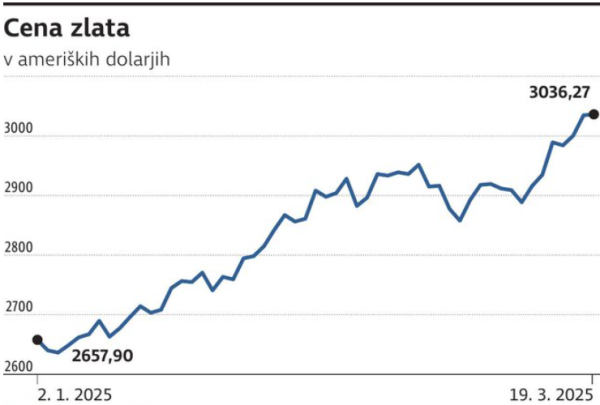 Zlato je prav tako doseglo rekordno vrednost v dolarjih, ta je trenutno nekaj več kot 3000 ameriških dolarjev za unčo. Rast cene spodbuja predvsem negotovost nadaljnje trgovinske vojne, zato se je povpraševanje po zlatu kot varni naložbi od začetka leta opazno povečalo.