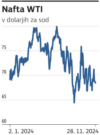 Nafta WTI oscilira okrog nivoja 70 dolarjev za sod. Ceno držijo naraščajoče marže rafinerij za destilatne izdelke ter dvomi o tem, ali bo Opec+ leta 2025 odpravil prostovoljne omejitve proizvodnje zaradi presežka na trgu. Napovedi za leto 2025 nakazujejo na nižje cene, saj se poleg že šibke rasti na Kitajskem gospodarski podatki slabšajo tudi v Evropi.