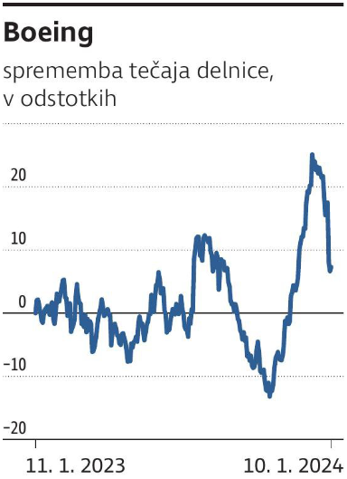 Novo negativno zgodbo doživlja tudi ameriški proizvajalec potniških letal Boeing, saj je med letom tako rekoč novega letala odtrgalo vrata na trupu. Agencija za letalstvo je predvsem zaradi pomanjkljivih navodil glede vzdrževanja in pregleda te komponente začasno prizemljila vsa letala tipa 737 max 9. Boeing bo seveda želel čim hitrejšo vključitev letal v ponovno uporabo, vseeno pa bo nadzornik dal zeleno luč šele takrat, ko bo problem zanesljivo rešen. Posledično to odpira možnost tožb zaradi izpada dohodka letalskih družb, saj so številni leti odpovedani, predvsem pa zmanjšuje ugled podjetja v primerjavi z glavnimi tekmeci. Delnica je tako samo letos izgubila že več kot 15 odstotkov svoje vrednosti.