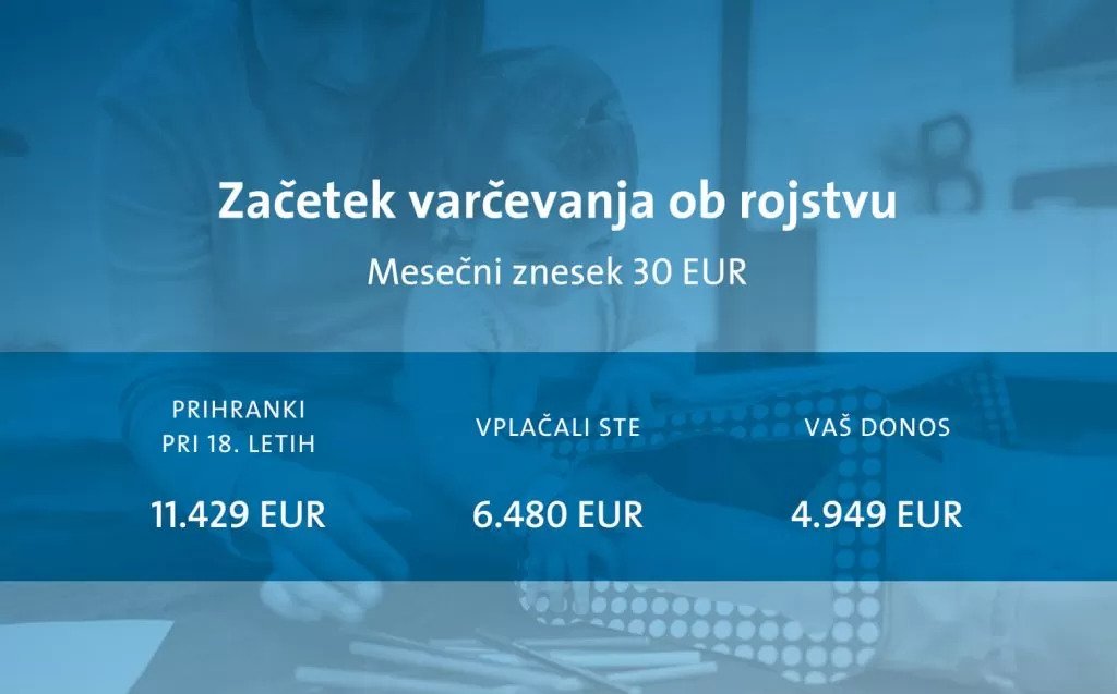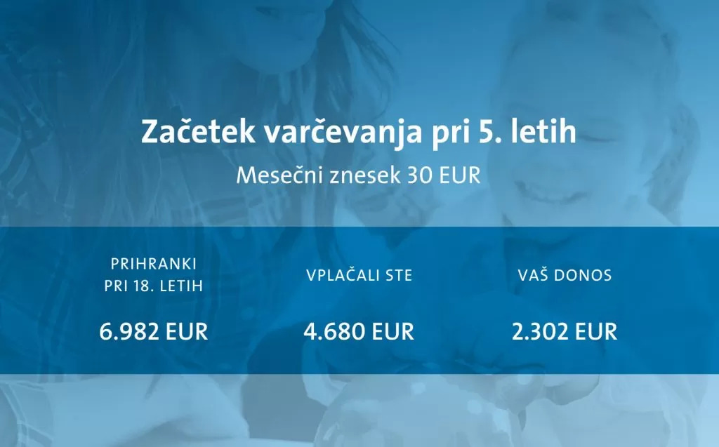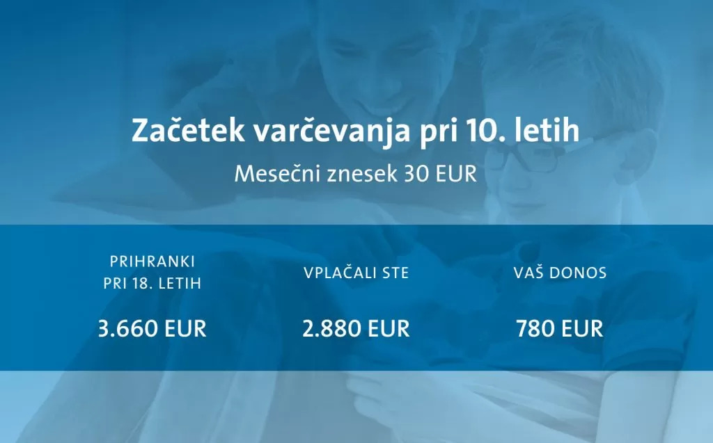Če primerjamo začetek varčevanja pri otrokovih 10. letih in začetek varčevanja pri njegovih 5. letih, je razvidno, da pri zgodnejšem začetku varčevanja vplačate 1.800 EUR več, skupno pa prihranite 3.300 EUR več. Zato ne odlašajte in začnite za otrokovo prihodnosti varčevati, takoj ko lahko.