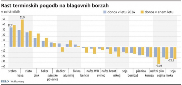 Pričakovali bi, da bo spodbujevalna politika največjih centralnih bank ter napovedane spodbude na Kitajskem dovolj dober razlog za rast blagovnih borz, vendar zadnje gibanje indeksa tega ne odraža. Več kot 30-odstotna rast cene zlata ter padec cen nafte in naravnega plina v zgodovini niso bili dober pokazatelj stanja globalnega gospodarstva. Vendar preden začnemo razmišljati o recesijskih scenarijih upoštevajmo, da je Bloombergov indeks blagovne borze kljub zmanjšanju v zadnjih letih še vedno višje, kot je bil v obdobju pred pandemijo covida-19. Poleg tega so se glede na zgodovino močno spremenili trendi porabe. Rast porabe nafte in plina se upočasnjuje zaradi šibkega kitajskega (in evropskega) gospodarstva, svoje pa bo v prihodnje prispeval tudi zeleni prehod. Ob povečanju elektrifikacije in naprednejših tehnoloških rešitev se krepi povpraševanje po nekaterih drugih surovinah, denimo bakru, cinku, aluminiju in srebru. Cene naštetih surovin so se letos namreč precej dvignile.