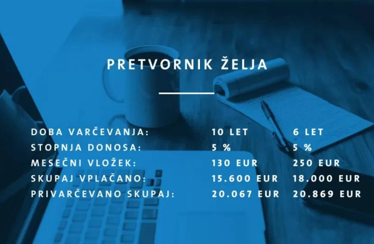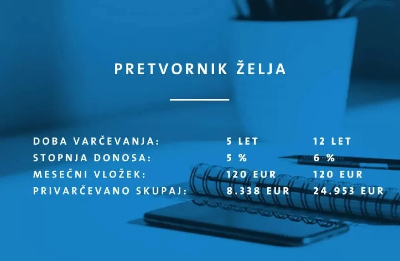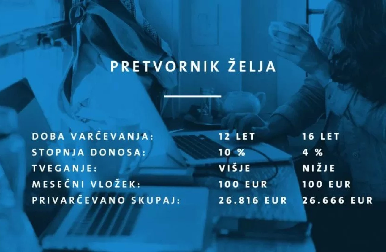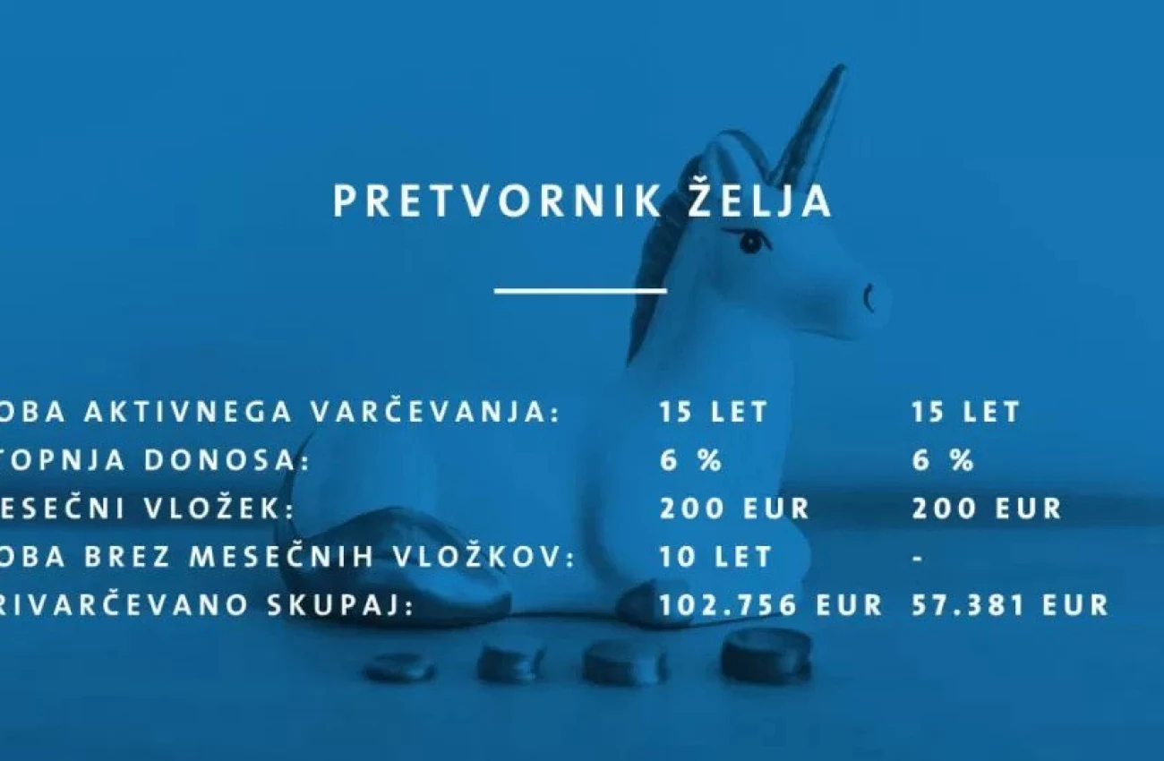 Vendar če za ponazoritev upoštevamo enak mesečni vložek in enako pričakovano povprečno letno stopnjo donosa, lahko v spodnjem izračunu vidimo, da bomo v 5 letih lahko privarčevali za nakup profesionalnega fotoaparata ali v 12 letih za potovanje okrog sveta. Vi pa najbolje veste, katere želje so za vas najpomembnejše in jih želite doseči. Temu ustrezno prilagodite tudi dobo varčevanja.