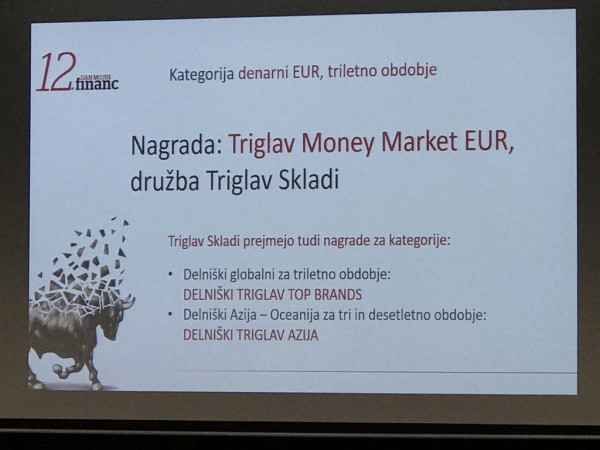 Obenem smo se v Triglav Skladih razveselili še treh nagrad za naše vzajemne sklade, in sicer za denarni sklad Triglav Sklad denarnega trga EUR (upravljavec: Aleš Čačovič) za triletno obdobje v kategoriji denarni EUR, delniški Triglav Top Brands v kategoriji delniški globalni za triletno obdobje ter delniški Triglav Azija v kategoriji delniški Azija – Oceanija za tri- in desetletno obdobje.