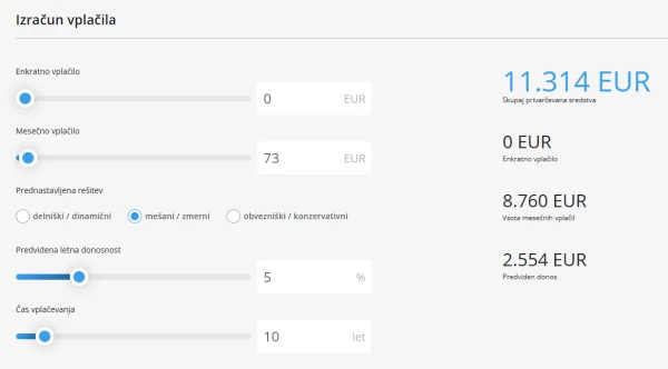 Kot pokaže vlagateljski kalkulator, bi ob predvideni letni donosnosti 5 % lahko skupno privarčevali 11.314 evrov ali 2.554 evrov več, kot bi znašala vplačila.**