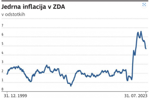 Tukaj je v prvi vrsti ameriški Fed, ki je po zapisih z zadnjega sestanka znova izrazil nelagodje glede inflacijskih pričakovanj in večino članov Feda podpira ponovno povišanje obrestne mere za četrtino odstotka. Zadnji ekonomski indikatorji, kot so gospodarska dinamika ter trg dela in najemnin, namreč ne kažejo dovolj prepričljive slike, da bi se t. i. jedrna inflacija (brez upoštevanja cen hrane in energentov) znižala na njihovo ciljno raven dva odstotka v prihodnjih dveh letih, kar ostaja ključna skrb ameriškega Feda. Torej sodeč po njihovem razmišljanju o še višjih obrestnih merah se zdi, da centralna banka postaja že nekoliko nestrpna do nadaljnjega zniževanja osnovne inflacije. Kratkoročno to morda ima smisel, saj napovedi Atlantskega Feda kažejo, da bo ameriško gospodarstvo v tretjem kvartalu, gledano iz kvartala v kvartal, celo preseglo petodstotno realno rast.