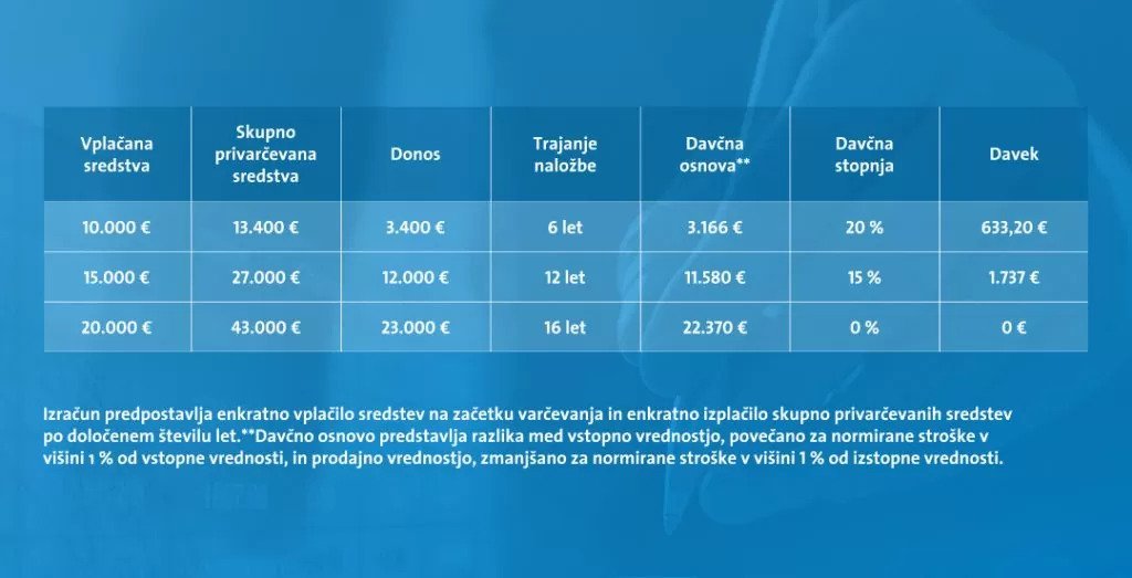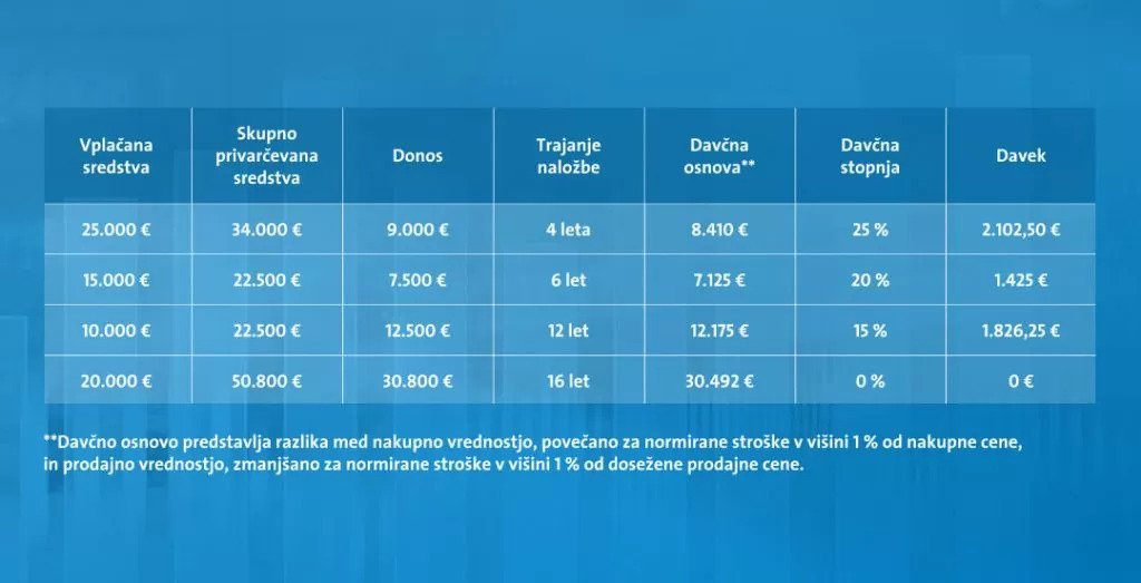 Nato le še pogledate v preglednico z davčnimi stopnjami zgoraj v članku ter enostavno izračunate, koliko bi plačali davka za konkreten znesek, vložen za določeno število let.