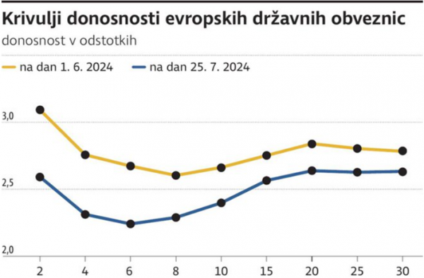 Zahtevana donosnost dveletnih evropskih državnih obveznic je od začetka junija padla za 50 bazičnih točk ali 0,50 odstotne točke. Zahtevana donosnost dveletnih ameriških državnih obveznic pa za kar 52 bazičnih točk. Nasprotno se je dolgoročnim obveznicam zahtevana donosnost zmanjšala veliko manj.