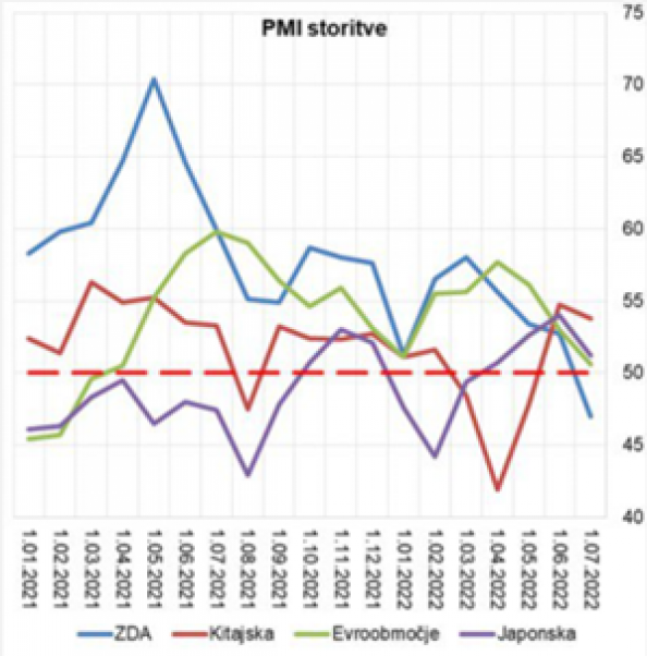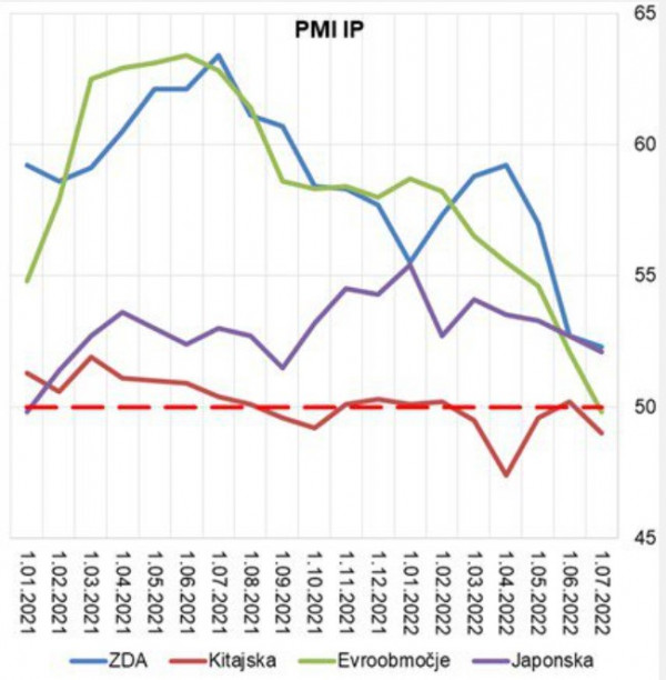 Indikatorji PMI (vrednost indikatorja 50 predstavlja mejo med gospodarsko ekspanzijo in kontrakcijo) nakazujejo, da se bo ohlajanje nadaljevalo, medtem ko recesijski vzorec še ni prisoten. Skupni vzorec največjih ekonomij so padajoče vrednosti omenjenih indikatorjev. Indikator predelovalnega sektorja (PMI IP) se je za evroobmočje in Kitajsko že spustil v območje kontrakcije, v ZDA je v območje kontrakcije zdrsnil storitveni segment. Japonska ohranja šibko rast v obeh segmentih.