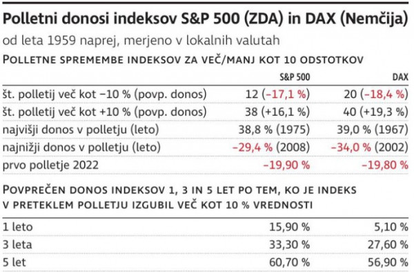 Od leta 1976, ko imamo na voljo podatke o donosnosti tako za delniški kot obvezniški trg, se je vedno dogajalo, da so obveznice pridobile vrednost, ko se je na delniških trgih zgodila korekcija in obratno. Tokrat pa ni tako in smo priča nečemu, kar se zgodi enkrat na stoletje. Na obvezniškem trgu je letos nasploh prvič, da so v enem polletju državne obveznice izgubile več kot 10 odstotkov vrednosti. Najvišjo izgubo v polletju do letos so obveznice beležile leta 1980, ko so izgubile 5,3 odstotka vrednosti. Na delniškem trgu je bilo takšnih obdobij več. Od leta 1959 (skupaj 125 polletij), ko imamo na voljo podatke tako za ameriški indeks S&P 500 kot za nemški DAX, je bilo v ZDA polletij, ko je indeks izgubil več kot 10 odstotkov vrednosti, 12, v Nemčiji pa 20. V teh obdobjih je ameriški indeks v povprečju izgubil 17,1 odstotka, nemški pa 18,4 odstotka. Na drugi strani je v istem obdobju ameriški indeks 38 polletij pridobil več kot 10 odstotkov vrednosti (povprečno 16,1 odstotka). Nemški indeks je imel takšnih polletij 40, ko je v povprečju pridobil 19,3 odstotka.