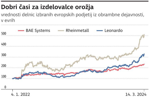 Rheinmetall, znan predvsem po proizvodnji tanka leopard, pričakuje, da se bo njegova prodaja letos povečala na približno deset milijard evrov, predvsem zaradi povečanega povpraševanja iz evropskih držav. Obseg naročil v podjetju znaša približno 40 milijard evrov, kar predstavlja skoraj 50-odstotno povečanje v primerjavi z lanskim letom. Italijanski Leonardo je konec prejšnjega meseca ob objavi rezultatov poročal o podobnih številkah, saj se je obseg prihodkov na področju letalstva (helikopterji), povečal za 34 odstotkov.