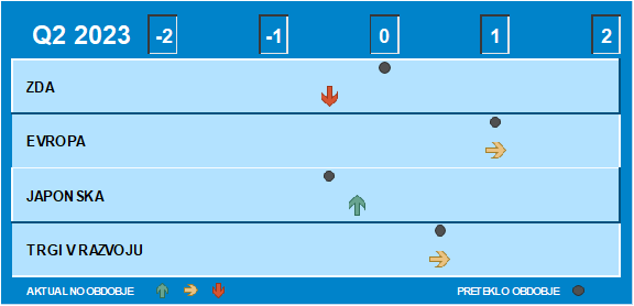Ugotavljamo, da je na regijski alokaciji za drugi kvartal 2023 najbolj privlačna regija Evropa, sledijo trgi v razvoju in Japonska, najmanj pa je privlačna ZDA.