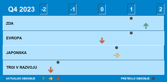 Ugotavljamo, da je na regijski alokaciji za četrti kvartal 2023 najbolj privlačna regija Severna Amerika, sledi Japonska in Evropa, najmanj pa je privlačna regija trgi v razvoju.