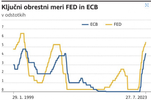 Evropska centralna banka (ECB) je prav tako na zasedanju 27. julija dvignila ključno obrestno mero za 0,25 odstotne točke na raven 4,25 odstotka, kar je izenačeno z najvišjo vrednostjo leta 2008, višje ravni smo imeli samo leta 2001. Z veliko gotovostjo lahko trdimo, da se bližamo vrhu obrestnih mer na krilih umirjanja inflacije in slabšanja gospodarske situacije v Evropi. Številni analitiki celo pričakujejo, da se bodo obrestne mere začele zniževati že v naslednjih šestih mesecih od zadnjega dviga in tudi zgodovina nam kaže, da je strmim dvigom navadno hitro sledilo znižanje obrestnih mer. Kar je v zgodovinskem pogledu neobičajno, je predvsem tesen trg dela, ki povzroča pritiske na dvige plač in dela inflacijo bolj trdovratno, kot bi si želeli.