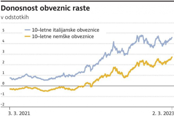Donosnost nemških državnih obveznic se je povišala na 2,7 odstotka, francoskih na 3,2 odstotka. Zanimivo, da se je bolje godilo perifernim obveznicam, ki so manj izgubile. Razlika v donosnosti med italijanskimi in nemškimi obveznicami je tako na rekordno nizki ravni, najnižji po lanskem aprilu. Italijanske obveznice so veliko izgubile po tem, ko je lani ECB končala nakupe po pandemskem programu PEPP in po zmagi populistične premierke Giorgie Meloni. Vseeno se ta ni izkazala za nevarno predsednico vlade, ki bi ogrozila stabilnost Italije. Res je tudi, da so se v zadnjih mesecih okrepila pričakovanja po mehkem pristanku tudi v evrskem območju, saj analitiki za letos napovedujejo 0,4-odstotno gospodarsko rast.