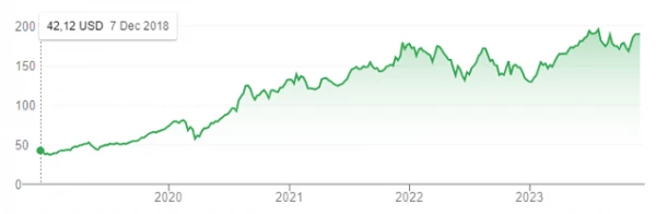 V začetku decembra 2018 je vrednost delnice znašala 42,12 dolarja, konec novembra 2023 pa 189,98 dolarja, kar predstavlja 350-odstotno rast v obdobju 5 let. Če bi torej v začetku decembra 2018 kupili za 20.000 evrov omenjenih delnic, bi konec novembra 2023 imeli že 90.000 evrov.