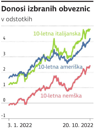 Sredina objava septembrske inflacije v evroobmočju, ki je dosegla 9,9 odstotka, je na obvezniških trgih povzročila dvig zahtevanih donosnosti obveznic. Donosnost desetletnih nemških državnih obveznic je tako že presegla 2,4 odstotka, slovenskih obveznic z isto ročnostjo pa 3,6 odstotka.