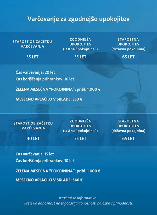 * Upoštevani podatki: mesečno vplačevanje v sklade v znesku 350 evrov, doba varčevanja 20 let, stopnja donosa 6 %, doba izplačevanja 10 let, pričakovana povprečna letna stopnja donosa neizplačanih sredstev 2 %, višina prispevkov za pokojninsko in zdravstveno zavarovanje 400 evrov.